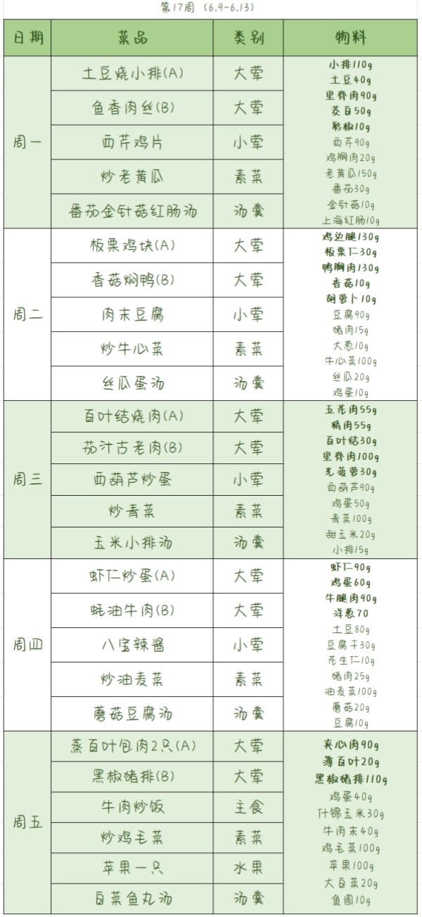 2024学年第二学期第十七周学生菜谱